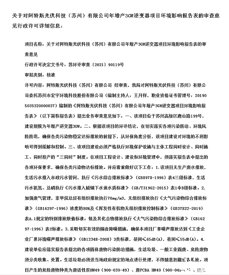 阿特斯光伏科技(蘇州)有限公司年增產(chǎn)3GW逆變器項目環(huán)境影響報告表建設單位公示