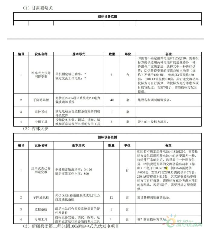 根據招標公告,甘肅嘉峪關供貨逆變器的交流總輸出功率(標稱)不低于120MW,吉林大安供貨逆變器的交流總輸出功率(標稱)不低于128.576MW,新疆兵團第二師34團100MW集中式光伏發電項目供貨逆變器的交流總輸出功率(標稱)不低于100.352MW,大姚縣石板箐二期光伏發電項目供貨逆變器的交流總輸出功率(標稱)不低于200MW,合計規模548.928MW。