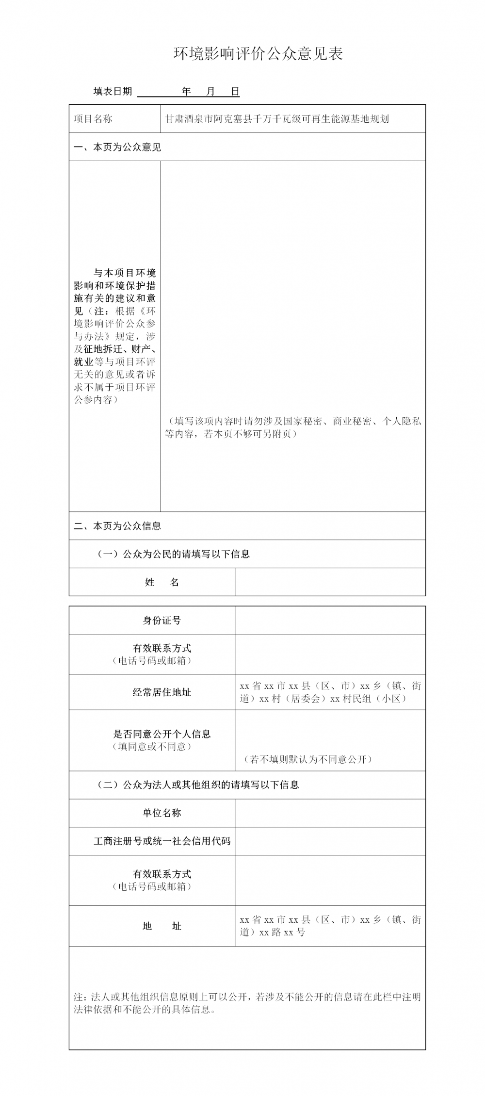 根據《環境影響評價公眾參與辦法》,現對甘肅酒泉市阿克塞縣千萬千瓦級可再生能源基地規劃環境影響評價進行公眾參與調查。