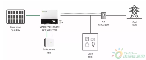 2 加裝儲能裝置 加裝防逆流裝置,成本比較低,但會浪費一些光伏發(fā)電,適合于短時間小功率的系統(tǒng),如果光伏裝機大于負載功率,或者長時間大于負載功率,建議使用儲能裝置。如下圖所示,系統(tǒng)由光伏組件,儲能逆變器、蓄電池、電流傳感器、負載等組件,當檢測到有電流流向電網時,啟動雙向變流器,把多出的電能儲存在蓄電池中,等需要時再放出來。