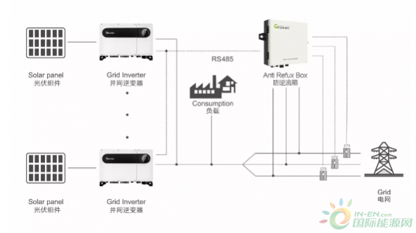 古瑞瓦特根據應用環(huán)境的不同,開發(fā)了兩種防逆流方案,一種是單機防逆流方案,一臺逆變器配一個雙向數字電表或電流傳感器CT,逆變器和電表通過485接口通信,雙向電表安裝在并網點,當逆變器檢測到電表有電流流向電網的,立即改變工作模式,從MPPT最大功率跟蹤工作模式轉到控制輸出功率工作模式,逐漸降低功率直至輸出電流為零。這種方式適合于80kW以下的單機模式,接線簡單,成本低,方便可靠,要求逆變器有485接口。