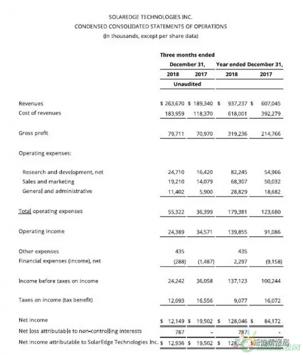 根據(jù)SolarEdge發(fā)布的消息,2018年全年營收9.372億美元,公認會計準則毛利率為34.1%,基于公認會計準則凈攤薄每股收益2.69美元。