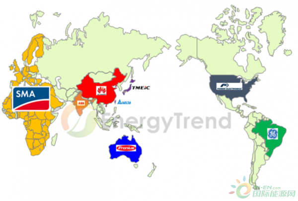 2018年全球各區(qū)域市場(chǎng)偏好的逆變器品牌 SMA普遍在EMEA(Eurpoe, Middle East, Africa)市場(chǎng)中獲得青睞;中國(guó)市場(chǎng)中首選仍就是華為,雖然在海外面臨中美貿(mào)易戰(zhàn)的威脅,但在中國(guó)仍舊是逆變器龍頭;美國(guó)市場(chǎng)則偏好西班牙廠商Power Electronics,主要仍是在大型電站項(xiàng)目上拔得頭籌;印度市場(chǎng)仍是ABB天下; 澳洲市場(chǎng)以?shī)W地利廠商Fronius為主;巴西市場(chǎng)則是GE;日本市場(chǎng)則是日本品牌TMEIC為主;臺(tái)灣市場(chǎng)則是以臺(tái)灣品牌臺(tái)達(dá)為首選。