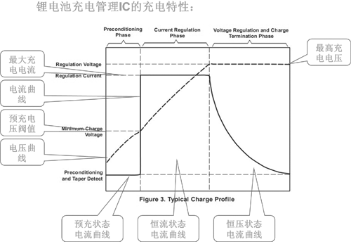 有上圖可以看出,鋰電池充電電流和電壓是動態(tài)變化的,這是由鋰電池本身的化學物質決定的。所以需要根據(jù)鋰電池本身的充電特性來配置充電IC的性能,以達到正確,安全,高效的使用鋰電池。日常表述中的“鋰電池充電電流”是針對鋰電池在充電過程中所處快速充電階段的充電電流而言的,作為一個動態(tài)的過程,鋰電池最理想充電電流實際上是分為三個階段的。常用鋰電池充電IC如TP4012A、TP8052、TP8056,本文最后處有部分介紹。