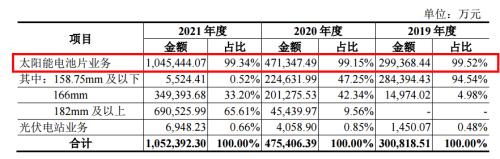 從收入構成來看,2019-2021年各期,潤陽股份太陽能電池片業務收入分別約為29.94億元、47.13億元和104.54億元,占當期主營業務收入比重分別約為99.52%、99.15%和99.34%。